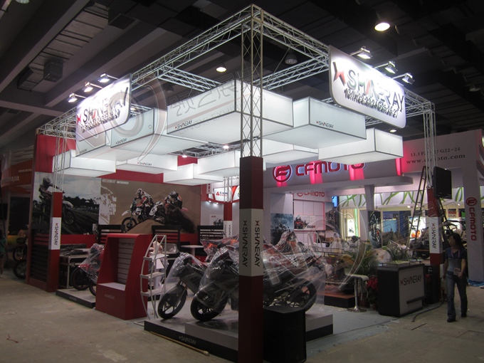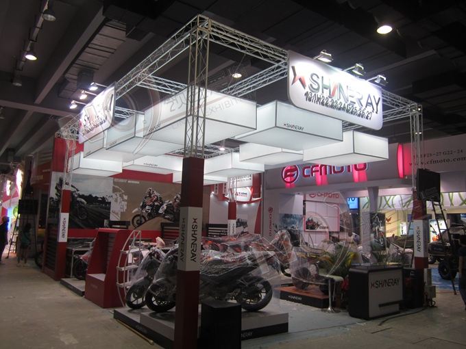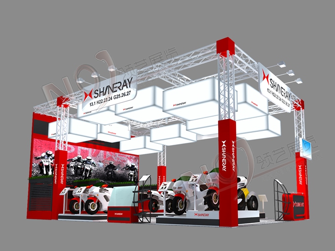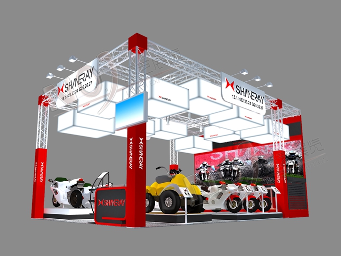契合鑫源摩托的品牌形象和產(chǎn)品特性,采用矩形結(jié)構(gòu),再搭配燈具燈光的效果,襯托出展位簡約、時尚的氛圍,突出一種現(xiàn)代、簡約的時尚品味。
