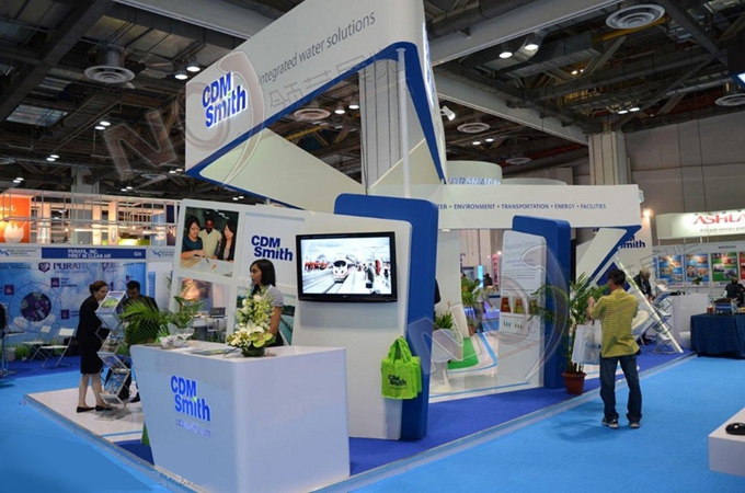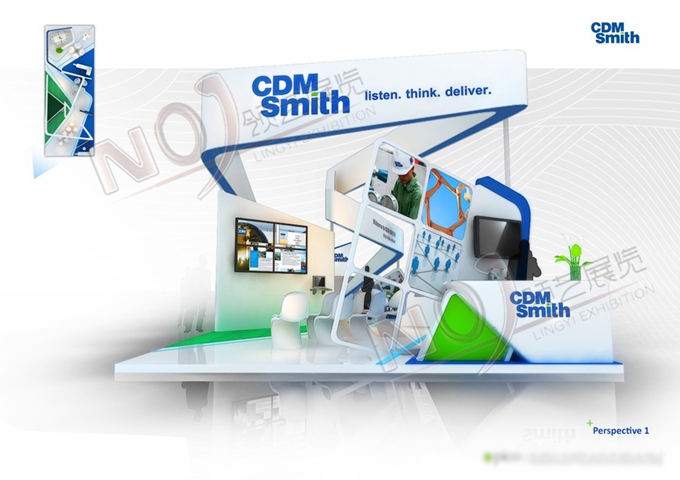 契合CDM Smith的品牌形象和產(chǎn)品特性,采用立體結(jié)構(gòu),再搭配燈具燈光的效果,襯托出展位高端、時(shí)尚的氛圍,突出一種現(xiàn)代、大氣的時(shí)尚品味。