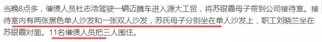 事情起因是這樣的,蘇銀霞開辦的公司資金周轉(zhuǎn)遇困,不得已向吳學(xué)占借款共計135萬元,約定月利息10%(遠(yuǎn)超法律規(guī)定的36%年利息上限)。在蘇銀霞共還款184萬元,并將一套140平米價值70萬的房子抵債后,“還剩最后17萬欠款,公司實在還不起了”。結(jié)果,就遭到涉黑勢力的恐怖逼債。