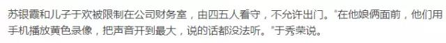 吳學(xué)占讓手下拉屎,并將蘇銀霞按進(jìn)馬桶里,要求還錢。案發(fā)當(dāng)天,蘇銀霞和于歡母子被關(guān)在了一起。“什么話難聽他罵什么,沒有錢你去賣,一次一百,我給你八十。學(xué)著喚狗的樣子喊小孩,讓孩子喊他爹?!倍胖竞泼撓掠跉g的鞋子,捂在蘇銀霞的嘴上。杜志浩脫下褲子,一只腳踩在沙發(fā)上,用極端手段污辱蘇銀霞。一個小時后,失控的于歡,抄起水果刀瘋狂捅向逼債者,結(jié)果四人中刀,其中杜志浩失血過多死亡。