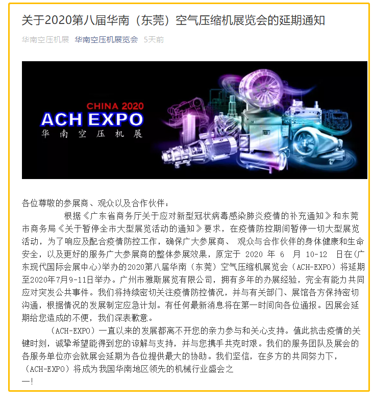 根據(jù)空壓機展設(shè)計搭建公司領(lǐng)藝展覽了解到,受疫情影響,原定于 2020 年 6 月 10-12 日在(廣東現(xiàn)代國際會展中心)舉辦的2020第八屆華南(東莞)空氣壓縮機展覽會(ACH-EXPO)將延期至2020年7月9-11日舉辦。如需空壓機展設(shè)計請聯(lián)系領(lǐng)藝展覽,希望我們能在空壓機展搭建上為您添磚加瓦,祝各位朋友收獲多多,滿載而歸!