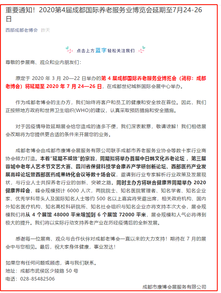 根據(jù)老博會(huì)設(shè)計(jì)搭建公司領(lǐng)藝展覽了解到,原定于 2020 年 3 月 20—22 日舉辦的第 4 屆成都國際養(yǎng)老服務(wù)業(yè)博覽會(huì)(簡稱:成都老博會(huì))將延期至 2020 年 7 月 24—26 日,在成都世紀(jì)城新國際會(huì)展中心舉辦。如需老博會(huì)設(shè)計(jì)請(qǐng)聯(lián)系領(lǐng)藝展覽,希望我們能在老博會(huì)搭建上為您添磚加瓦,祝各位朋友收獲多多,滿載而歸!