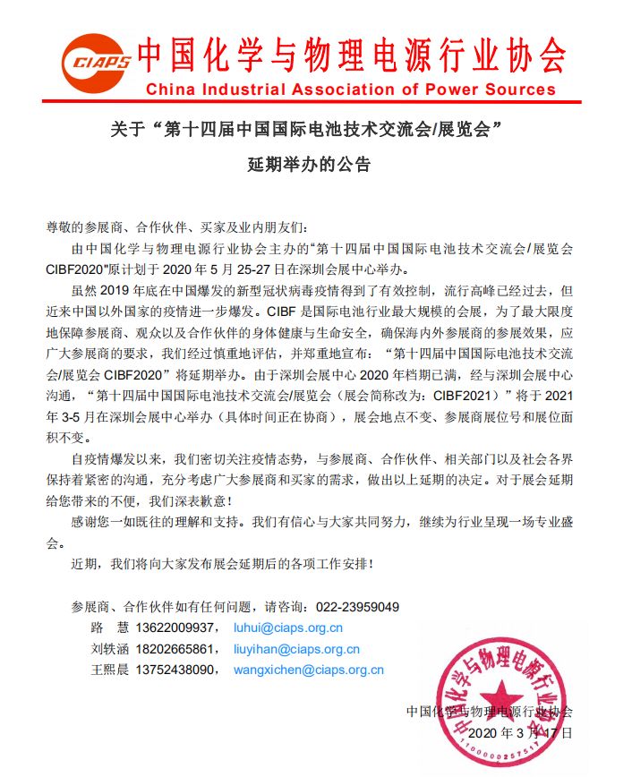 根據(jù)電池展設(shè)計搭建公司領(lǐng)藝展覽了解到,由中國化學(xué)與物理電源行業(yè)協(xié)會主辦的“第十四屆中國國際電池技術(shù)交流會/展覽會CIBF2020"原計劃于2020年5月25-27日在深圳會展中心舉辦。由于深圳會展中心2020年檔期已滿,經(jīng)與深圳會展中心溝通,“第十四屆中國國際電池技術(shù)交流會/展覽會(展會簡稱改為:CIBF2021)”將于2021年3-5月在深圳會展中心舉辦(具體時間正在協(xié)商),展會地點不變、參展商展位號和展位面積不變。。如需電池展展會設(shè)計請聯(lián)系領(lǐng)藝展覽,希望我們能在電池展搭建上為您添磚加瓦,祝各位朋友收獲多多,滿載而歸!