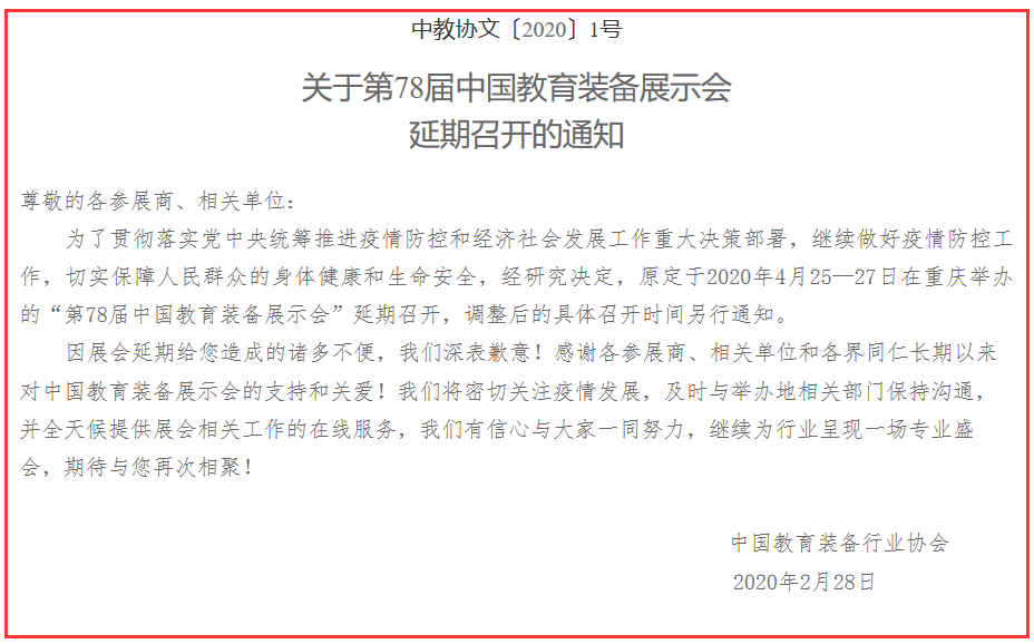根據(jù)重慶教育展設(shè)計搭建公司領(lǐng)藝展覽了解到,為了貫徹落實黨中央統(tǒng)籌推進疫情防控和經(jīng)濟社會發(fā)展工作重大決策部署,繼續(xù)做好疫情防控工作,切實保障人民群眾的身體健康和生命安全,經(jīng)研究決定,原定于2020年4月25—27日在重慶舉辦的“第78屆中國教育裝備展示會”延期召開,調(diào)整后的具體召開時間另行通知。如需重慶教育展設(shè)計請聯(lián)系領(lǐng)藝展覽,希望我們能在重慶教育展搭建上為您添磚加瓦,祝各位朋友收獲多多,滿載而歸!