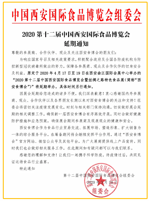 根據(jù)食博會設(shè)計搭建公司領(lǐng)藝展覽了解到,原定于2020年4月17日至19日在西安曲江國際會展中心舉辦的“2020第十二屆中國西安國際食品博覽會暨絲綢之路特色食博會(簡稱“西安食博會”)”將延期舉辦,具體時間另行通知。如需食博會設(shè)計請聯(lián)系領(lǐng)藝展覽,希望我們能在食博會搭建上為您添磚加瓦,祝各位朋友收獲多多,滿載而歸!