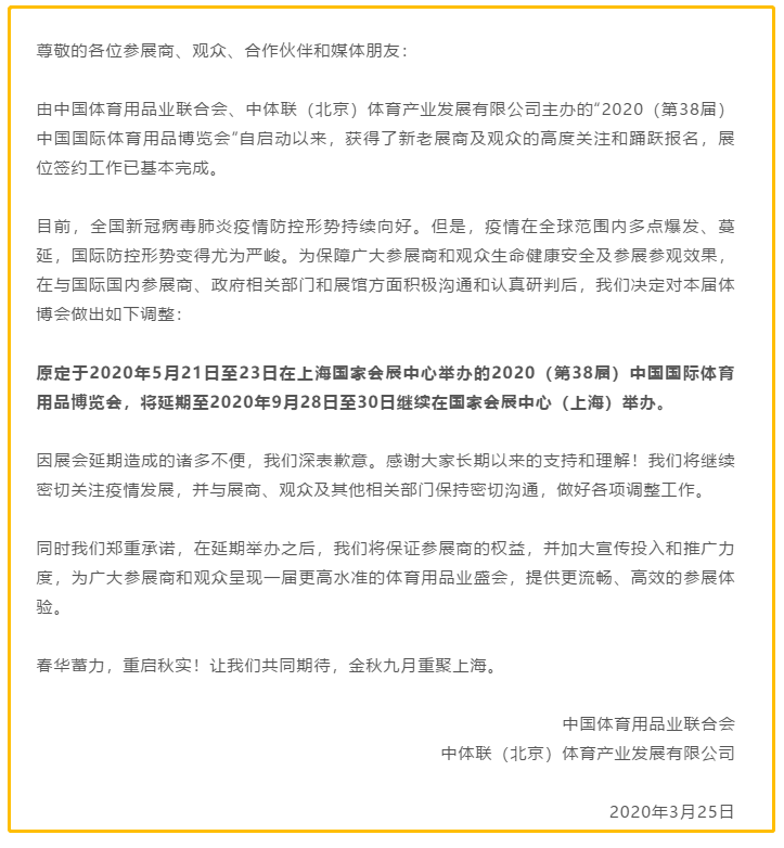 根據(jù)體博會設計搭建公司領藝展覽了解到,原定于2020年5月21日至23日在上海國家會展中心舉辦的2020(第38屆)中國國際體育用品博覽會,將延期至2020年9月28日至30日繼續(xù)在國家會展中心(上海)舉辦。如需體博會設計請聯(lián)系領藝展覽,希望我們能在體博會搭建上為您添磚加瓦,祝各位朋友收獲多多,滿載而歸!