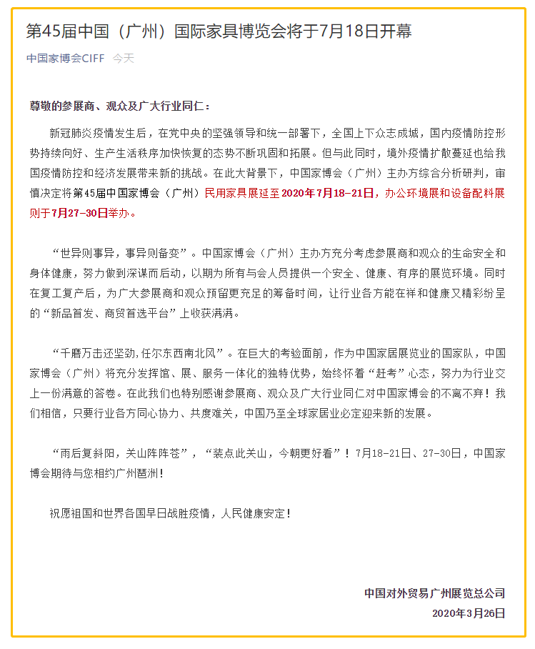 根據(jù)家具展設(shè)計搭建公司領(lǐng)藝展覽了解到,第45屆中國家博會(廣州)民用家具展延至2020年7月18-21日,辦公環(huán)境展和設(shè)備配料展則于7月27-30日舉辦。如需家具展設(shè)計請聯(lián)系領(lǐng)藝展覽,希望我們能在家具展搭建上為您添磚加瓦,祝各位朋友收獲多多,滿載而歸!