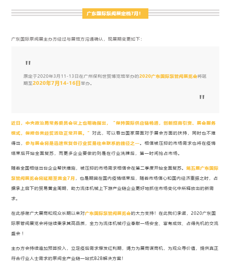 根據(jù)泵閥展設(shè)計(jì)搭建公司領(lǐng)藝展覽了解到,隨著全國(guó)相繼出臺(tái)企業(yè)幫扶措施,被壓抑的市場(chǎng)需求相信會(huì)在第二季度開始全面復(fù)蘇。第五屆廣東國(guó)際泵管閥展覽會(huì)將延期至黃金7月,也是期冀在國(guó)內(nèi)疫情結(jié)束后,隨著市場(chǎng)信心和國(guó)內(nèi)經(jīng)濟(jì)重振之時(shí),占據(jù)承上啟下的貿(mào)易黃金周期,助力流體機(jī)械上下游產(chǎn)業(yè)鏈企業(yè)更好地抓住市場(chǎng)變化中所釋放出的新需求。如需泵閥展設(shè)計(jì)請(qǐng)聯(lián)系領(lǐng)藝展覽,希望我們能在泵閥展搭建上為您添磚加瓦,祝各位朋友收獲多多,滿載而歸!