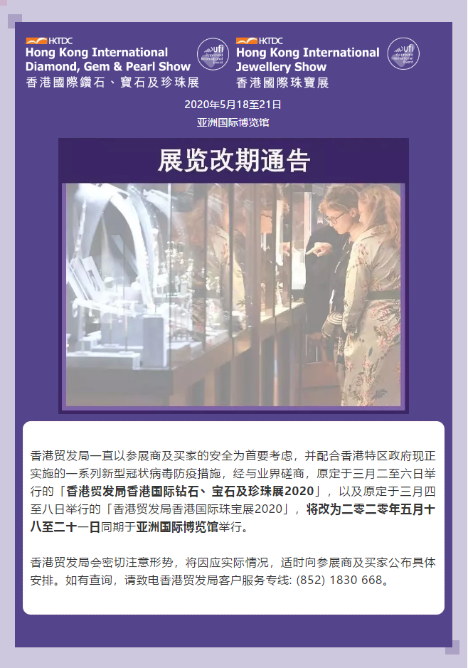 根據(jù)香港珠寶展設(shè)計搭建公司領(lǐng)藝展覽解到,原定于三月二至六日舉行的「香港貿(mào)發(fā)局香港國際鉆石丶寶石及珍珠展2020」,以及原定于三月四至八日舉行的「香港貿(mào)發(fā)局香港國際珠寶展2020」,將改為二零二零年五月十八至二十一日同期于亞洲國際博覽館舉行。如需香港珠寶展設(shè)計請聯(lián)系領(lǐng)藝展覽,希望我們能在香港珠寶展搭建上為您添磚加瓦,祝各位朋友收獲多多,滿載而歸!