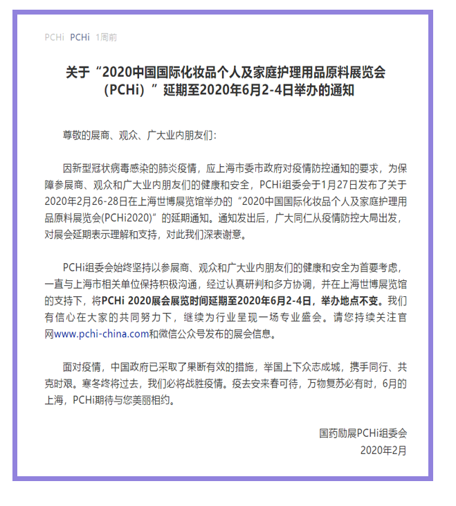 根據(jù)上海家庭護(hù)理展設(shè)計(jì)搭建公司領(lǐng)藝展覽了解到,因新型冠狀病毒感染的肺炎疫情,應(yīng)上海市委市政府對(duì)疫情防控通知的要求,為保障參展商、觀眾和廣大業(yè)內(nèi)朋友們的健康和安全,PCHi組委會(huì)于1月27日發(fā)布了關(guān)于2020年2月26-28日在上海世博展覽館舉辦的“2020中國(guó)國(guó)際化妝品個(gè)人及家庭護(hù)理用品原料展覽會(huì)(PCHi2020)”的延期通知。將PCHi 2020展會(huì)展覽時(shí)間延期至2020年6月2-4日,舉辦地點(diǎn)不變。我們將繼續(xù)密切關(guān)注展會(huì)動(dòng)態(tài),希望我們能在上海家庭護(hù)理展搭建上為您添磚加瓦,祝各位朋友收獲多多,滿載而歸!嚴(yán)寒終將過(guò)去,春天必將來(lái)臨。上海家庭護(hù)理展設(shè)計(jì)搭建公司領(lǐng)藝展覽向抗疫一線的所有英雄致敬!