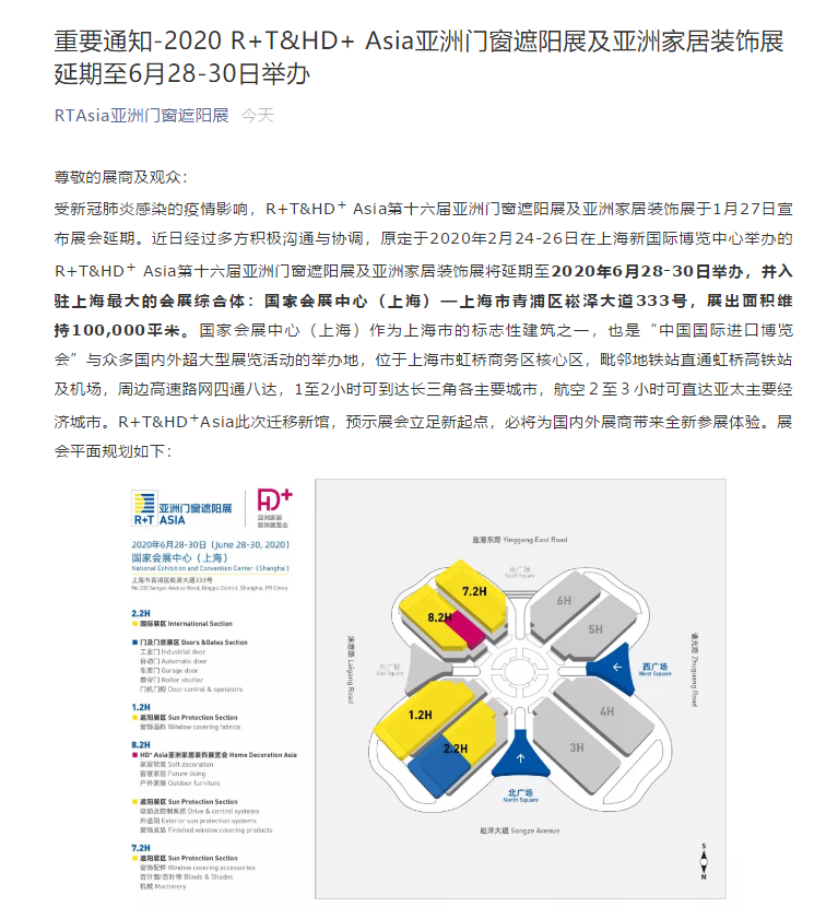 根據(jù)亞洲門窗遮陽展設(shè)計(jì)搭建公司領(lǐng)藝展覽解到,受新冠肺炎感染的疫情影響,R+T&HD+ Asia第十六屆亞洲門窗遮陽展及亞洲家居裝飾展于1月27日宣布展會(huì)延期。近日經(jīng)過多方積極溝通與協(xié)調(diào),原定于2020年2月24-26日在上海新國際博覽中心舉辦的R+T&HD+ Asia第十六屆亞洲門窗遮陽展及亞洲家居裝飾展將延期至2020年6月28-30日舉辦,并入駐上海最大的會(huì)展綜合體:國家會(huì)展中心(上海)—上海市青浦區(qū)崧澤大道333號(hào),展出面積維持100,000平米。如需亞洲門窗遮陽展設(shè)計(jì)請(qǐng)聯(lián)系領(lǐng)藝展覽,希望我們能在亞洲門窗遮陽展搭建上為您添磚加瓦,祝各位朋友收獲多多,滿載而歸!
