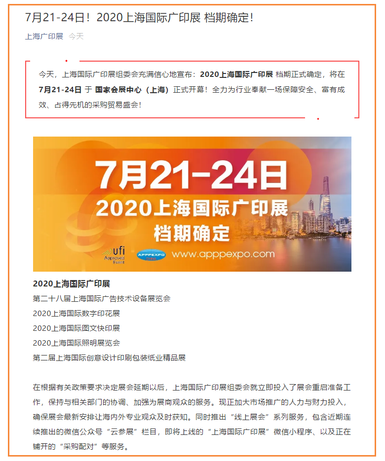 根據(jù)上海廣印展設(shè)計(jì)搭建公司領(lǐng)藝展覽了解到,今天,上海國(guó)際廣印展組委會(huì)充滿(mǎn)信心地宣布:2020上海國(guó)際廣印展 檔期正式確定,將在7月21-24日 于 國(guó)家會(huì)展中心(上海)正式開(kāi)幕!全力為行業(yè)奉獻(xiàn)一場(chǎng)保障安全、富有成效、占得先機(jī)的采購(gòu)貿(mào)易盛會(huì)!如需上海廣印展設(shè)計(jì)請(qǐng)聯(lián)系領(lǐng)藝展覽,希望我們能在上海廣印展搭建上為您添磚加瓦,祝各位朋友收獲多多,滿(mǎn)載而歸!
