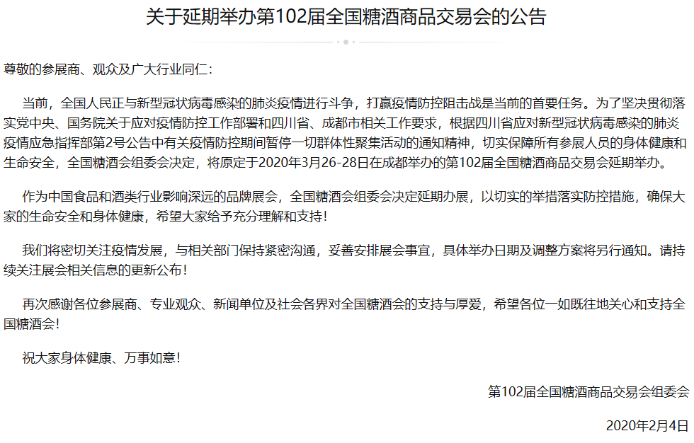 當(dāng)前,全國人民正與新型冠狀病毒感染的肺炎疫情進(jìn)行斗爭,打贏疫情防控阻擊戰(zhàn)是當(dāng)前的首要任務(wù)。為了堅決貫徹落實(shí)黨中央、國務(wù)院關(guān)于應(yīng)對疫情防控工作部署和四川省、成都市相關(guān)工作要求,根據(jù)四川省應(yīng)對新型冠狀病毒感染的肺炎疫情應(yīng)急指揮部第2號公告中有關(guān)疫情防控期間暫停一切群體性聚集活動的通知精神,切實(shí)保障所有參展人員的身體健康和生命安全,全國糖酒會組委會決定,將原定于2020年3月26-28日在成都舉辦的第102屆全國糖酒商品交易會延期舉辦。如需成都糖酒展設(shè)計請聯(lián)系領(lǐng)藝展覽,希望我們能在成都糖酒展搭建上為您添磚加瓦,祝各位朋友收獲多多,滿載而歸!
