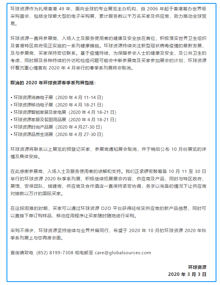 根據(jù)餐廚用品展設計搭建公司領藝展覽了解到,環(huán)球資源作為扎根香港 49 年、面向全球的專業(yè)展覽主辦機構(gòu),自 2006 年起于香港籌辦世界級采購盛會,包括全球最大型的電子采購展,累計服務數(shù)以千萬名買家及供應商,致力推動全球貿(mào)易?;谝咔槌掷m(xù),為保障參會人士的健康及安全,及公共衛(wèi)生的考慮,同時顧及各種持續(xù)的外訪和檢疫問題可能會中斷參展商及買家參加展會的計劃,環(huán)球資源懷著沉重心情宣布 2020 年 4 月舉行的春季系列展將會取消。原計劃環(huán)球資源家居及餐廚用品展展會時間是2020 年 4 月 18-21 日。環(huán)球資源將聯(lián)系展覽的預登記買家、參展商通知展會取消,并于稍后公布 10 月份展覽的詳情及具體安排。如需餐廚用品展展臺設計請聯(lián)系領藝展覽,希望我們能在餐廚用品展展臺搭建上為您添磚加瓦,祝各位朋友收獲多多,滿載而歸!