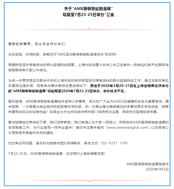 根據(jù)上海服裝展設(shè)計(jì)搭建公司領(lǐng)藝展覽了解到,原定于2020年3月29-31日在上海世博展覽館舉辦的“AME服裝智能制造展”將延期至2020年7月23-25日舉辦,舉辦地點(diǎn)不變。如需上海展臺(tái)設(shè)計(jì)請(qǐng)聯(lián)系領(lǐng)藝展覽,希望我們能在上海展臺(tái)搭建上為您添磚加瓦,祝各位朋友收獲多多,滿載而歸!