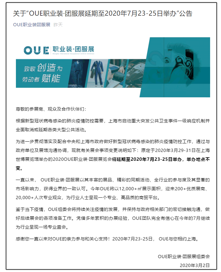 根據(jù)上海服裝展設(shè)計搭建公司領(lǐng)藝展覽了解到,為進(jìn)一步貫徹落實及配合中央和上海市政府做好新型冠狀病毒感染的肺炎疫情防控工作,通過與政府單位及展館溝通協(xié)調(diào),現(xiàn)就有關(guān)展會事項變更說明如下:原定于2020年3月29-31日在上海世博展覽館舉辦的2020OUE職業(yè)裝·團(tuán)服展覽會將延期至2020年7月23-25日舉辦,舉辦地點不變。如需上海服裝展設(shè)計請聯(lián)系領(lǐng)藝展覽,希望我們能在上海展臺搭建上為您添磚加瓦,祝各位朋友收獲多多,滿載而歸!