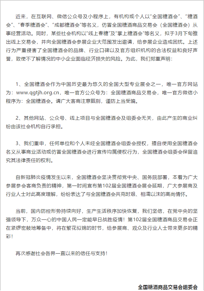 根據(jù)糖酒會(huì)設(shè)計(jì)搭建公司領(lǐng)藝展覽從糖酒會(huì)組委會(huì)官網(wǎng)了解到,近來,在互聯(lián)網(wǎng)、微信公眾號及小程序上,有機(jī)構(gòu)或個(gè)人以“全國糖酒會(huì)”、“糖酒會(huì)”、“春季糖酒會(huì)”、“成都糖酒會(huì)”等名義,仿冒全國糖酒商品交易會(huì)(全國糖酒會(huì))從事經(jīng)營活動(dòng)。同時(shí),某些社會(huì)機(jī)構(gòu)以“線上春糖”及“掌上糖酒會(huì)”等名義,擬于3月下旬推出線上交易會(huì),并向全國糖酒會(huì)參展企業(yè)大范圍發(fā)出邀請,給參展企業(yè)造成困擾。上述行為嚴(yán)重侵害了全國糖酒會(huì)的品牌、行業(yè)口碑以及官方組織機(jī)構(gòu)的合法權(quán)益和良好聲譽(yù),致使不了解情況的中小企業(yè)面臨經(jīng)濟(jì)損失的風(fēng)險(xiǎn)。