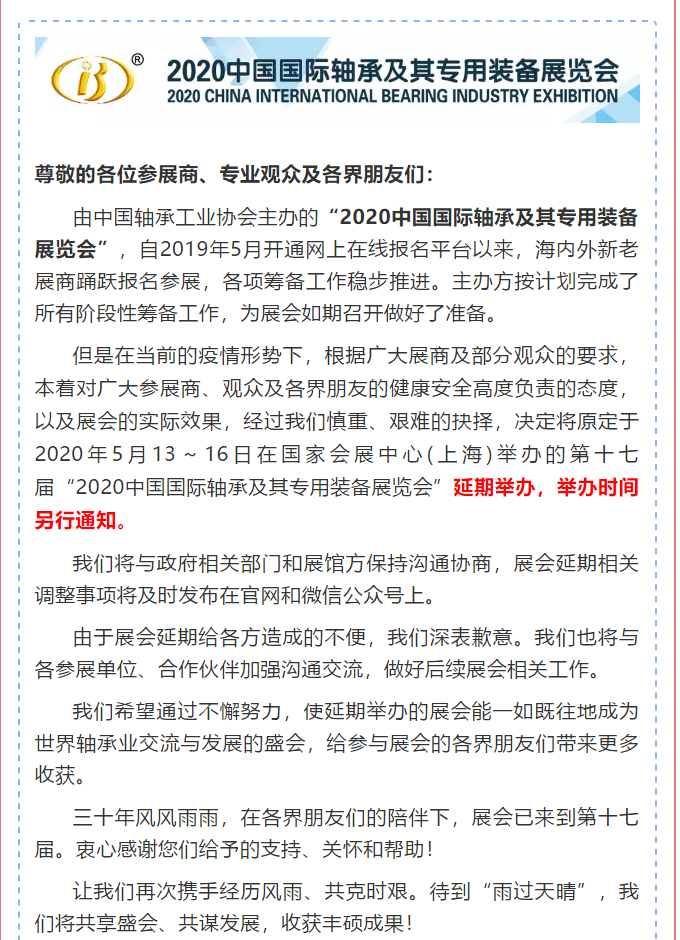 根據(jù)軸承展設(shè)計搭建公司領(lǐng)藝展覽了解到,原定于2020年5月13~16日在國家會展中心(上海)舉辦的第十七屆“2020中國國際軸承及其專用裝備展覽會”延期舉辦,舉辦時間另行通知。如需軸承展設(shè)計請聯(lián)系領(lǐng)藝展覽,希望我們能在軸承展搭建上為您添磚加瓦,祝各位朋友收獲多多,滿載而歸!