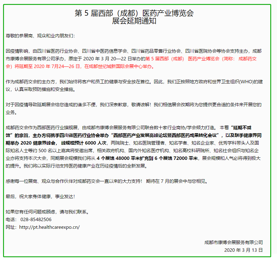 根據(jù)成都展臺(tái)搭建公司領(lǐng)藝展覽了解到,原定于 2020 年 3 月 20—22 日舉辦的第 5 屆西部(成都) 醫(yī)藥產(chǎn)業(yè)博覽會(huì)(簡(jiǎn)稱: 成都藥交會(huì))將延期至 2020 年 7月24—26 日,在成都世紀(jì)城新國(guó)際會(huì)展中心舉辦。如需成都展會(huì)設(shè)計(jì)請(qǐng)聯(lián)系領(lǐng)藝展覽,希望我們能在成都展會(huì)搭建上為您添磚加瓦,祝各位朋友收獲多多,滿載而歸!